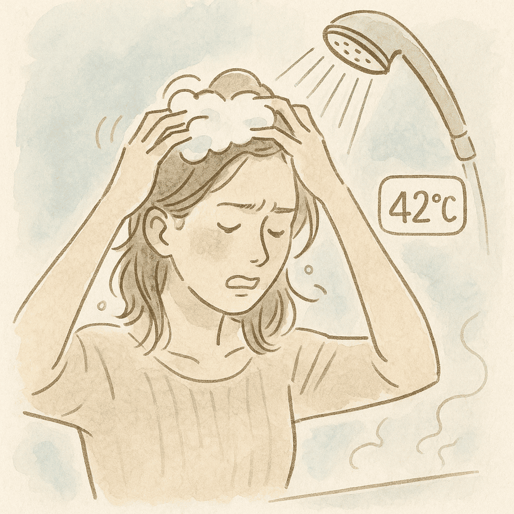 寒い季節ほど熱めのシャワーを使いたくなりますが、42℃以上のお湯は頭皮の必要な皮脂まで洗い流してしまい、乾燥とフケ・かゆみを引き起こす原因に。