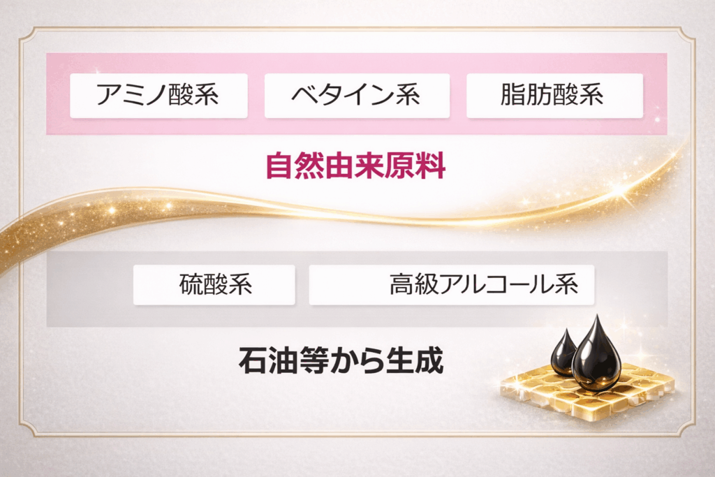 市販の多くは高級アルコール系(ラウレス硫酸Naなど)や硫酸系で、